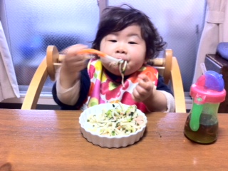やれパンパパン(パン)だのゴ(りんご)だのモーモー(牛乳)だのバ(バナナ)だのギャーギャー所望してムッシムッシ平らげ、挙句に最近やけに気に入っているフ(お麩そのまんま)をガーガー所望し、「おねがいちま…ちゅ!」やったらあげると言うと。