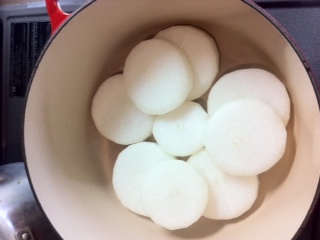 先日隣の畑で頂いた白い大根足を輪切りにして面取り、ルクに並べる。