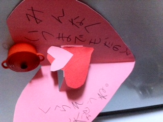 雪の中を転げ回ってビットンビットンになって真っ赤な顔した少年(自称しあわせ確率100%)が、尻尾をブンブン降って帰ってくるなり、デカいハート型のカードをぶら下げて来た。