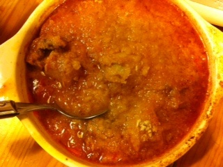鳥シメて(キャー)白ソーセージにしたのと猪シメたのん(ギャー)をトマトベースのソースでパン粉と一緒に煮込んでオーブンで焼いた、ナントカナントカ(だから何)は酒に良く合う。呑。