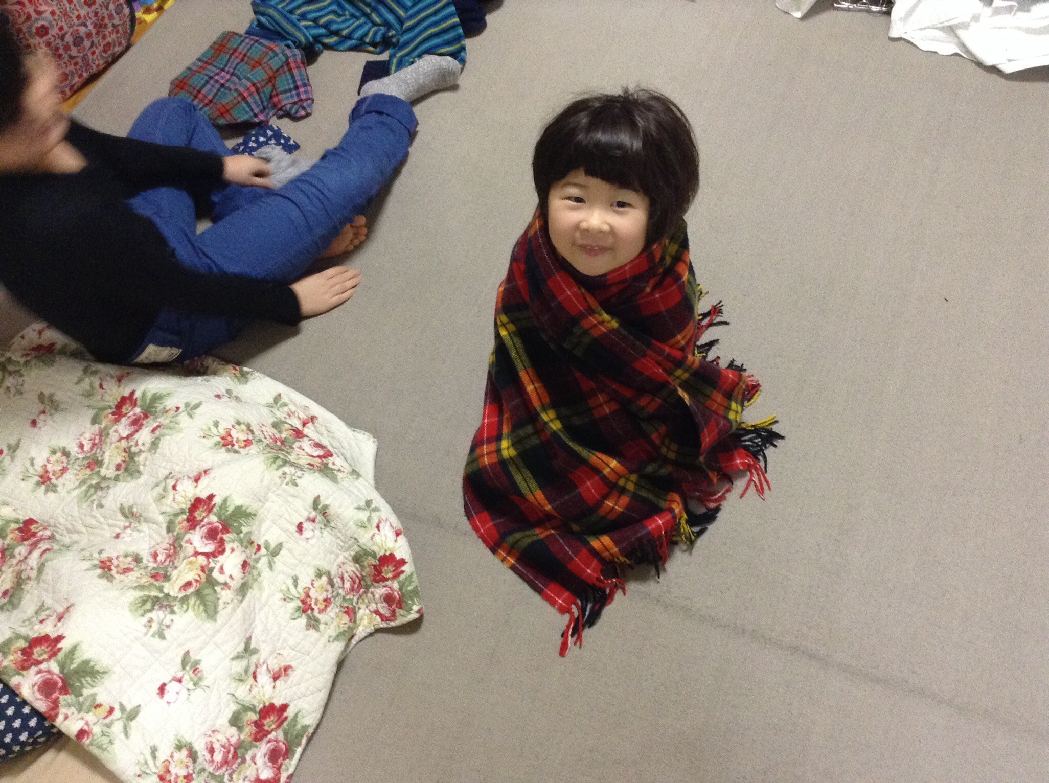 朝早く起きると、カリンちゃんは寒い寒いと言うので、毛布に包んで置いておきます。
