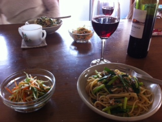 一息ついたお昼に友が遊びにきたので、ちゃちゃっとパスタでランチ。シッカリおかーちゃんの仕事しましたからね、ワインもつけちゃうぞ!へっへー。
