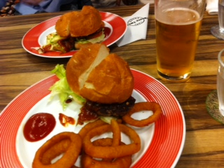 ガッツリ系のアボカドバーガーには、生ビールが合う。サイドのオニオンリングが非常に宜しい。