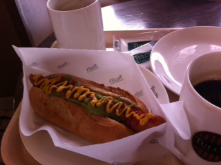 旦那さんの出発前に、ちょっと気分転換。タリーズのホットドッグは、矢張りパンが美味い。アボカドの上にケチャップとマスタードで、物凄い極彩色のドッグ。