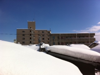 北国の雪の晴れ間は、皆すコップ片手に雪と格闘、大忙し。皆様ここぞとばかりに屋根に積もった1メーター程の屋根雪を二階の窓から下ろしている。ここ数日でこれだけ積もった、と近所のおじさんは完全にゆきに埋れた車を駐車場から掘り起こしていた。