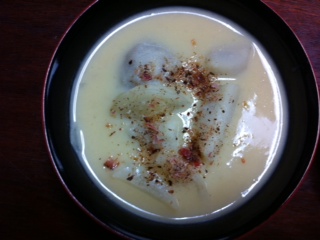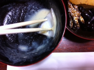 雑煮は昆布出汁に白味噌。腕もデカイが分量的には一人頭50g程の白味噌イン、非常に濃口。