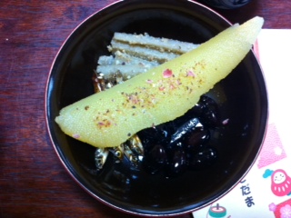 黒豆、たたきごぼう、ごまめ、数の子。三日間一緒。