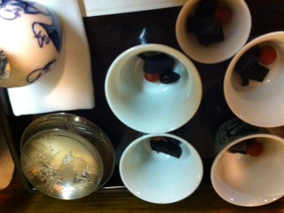 中には結び昆布、黒豆の炊いたん、梅干し(申年に漬けた梅が一番良い)が入っている。ここに、おくみどりの煎茶を注いだものを主人の「お祝いします」の号令と共に、その年の恵方に坐して向かい戴く。コレを三日間。