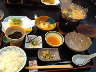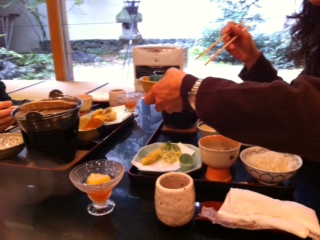 揚げたての野菜の天ぷらに小鉢二品、生湯葉、氷見うどんの小鍋、漬物にご飯、食後の蜜柑のゼリー寄せには珈琲までつく大満足の大盛りぶり。ご飯は勿論、お代わりオッケーで、皆オカワリ上等。因みに通常時の昼膳には、天ぷらにはエビが付き、旬のお造りが登場する。