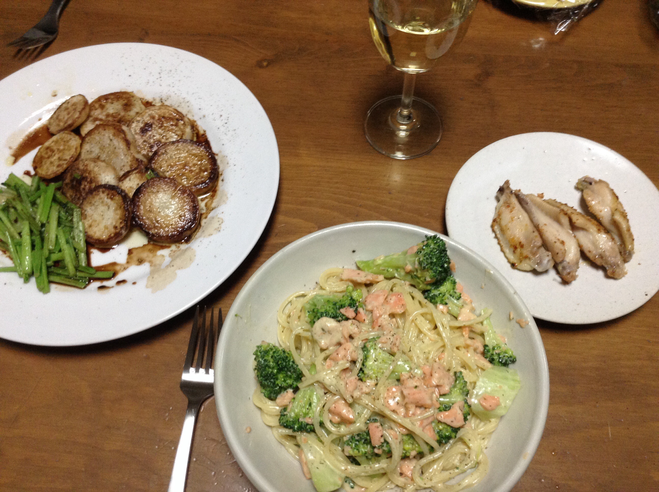 採れたての秋ブロッコリーをたっぷり使った秋鮭のディルクリームパスタと合わせて、惜秋の晩喰。