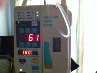 筋肉と体重はみるみる落ちて、点滴で血管はボロボロ、それでもおさまらないお腹の張りを抑えるべく日々上げ続けられる投薬量も、遂に限界ギリギリの2A59ml/hの大台まで来た(因みにMAXは2A60まで)。